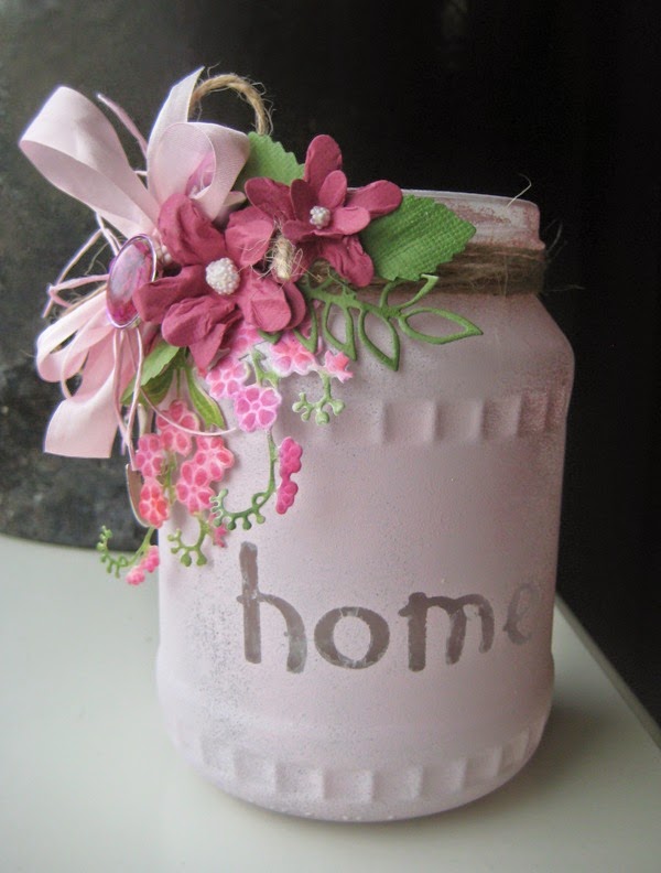 Op een basiskaart plakte ik washitape om boven en onder te bewerken met een stempel en Versamark en daarna kleur aan te brengen met PanPastel. Ik kon het niet laten om er toch mijn eigen versie van te maken en er lint en een bloemetje bij te doen. :)